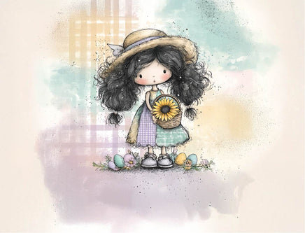 Tote Panel Easter Girl Brown Hair One Sunflower