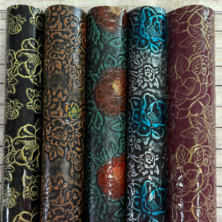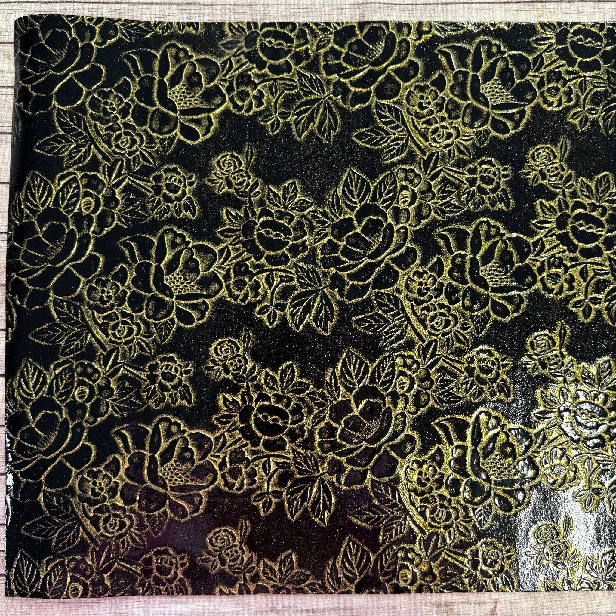 Glossy Floral Embossed Vinyl Black With Gold Flowers