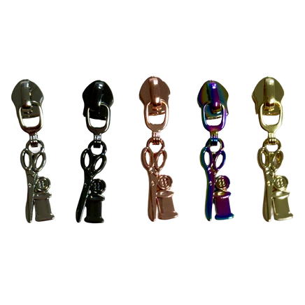 Sewing Scissors and Thread Zipper Pull – Size 5 (Silver, Gunmetal, Rainbow, Rose Gold & Gold)